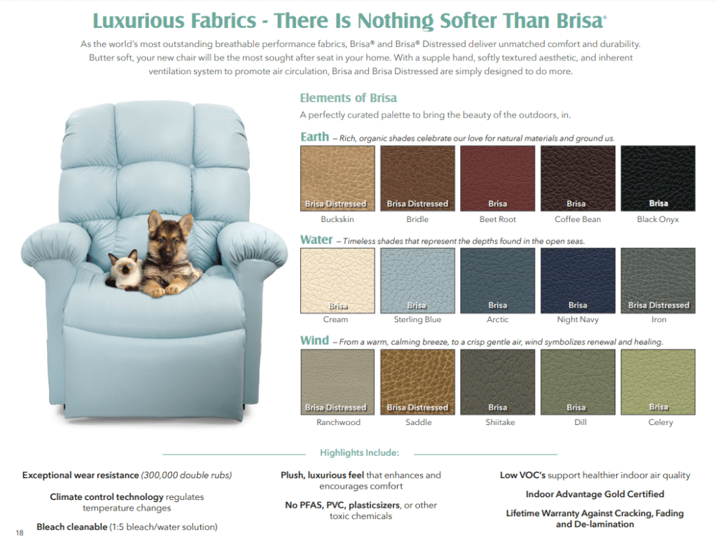 • UltraPlush Brisa fabric offers the refined look of leather but with a luxuriously soft, breathable, and temperature-regulating design. Unlike traditional leather, Brisa has a plush, luxurious feel that is gentle to touch, providing unmatched comfort without the stiffness or stickiness that leather can sometimes have.